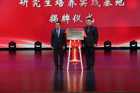 副校长蔡立东、长春嘉诚信息技术股份有限公司总经理齐井春、聚法科技(长春)有限公司董事长、CEO梁海强、长春市把手科技有限公司创始人刘思铭共同为研究生培养实践基地揭牌;长春嘉诚信息技术股份有限公司检察事业部总经理崔放代表实践基地致辞。