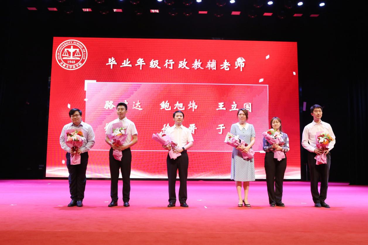 副院长刘晓林教授宣读毕业生名单后,院长何志鹏教授、院党委书记周春国教授、法学学位评定分委员会副主席张旭教授、校政策与法规办公室主任任喜荣教授、理论法学研究中心主任兼副院长杜宴林教授、副院长曹险峰教授、王充教授、刘晓林教授等八位主礼教授登台为毕业生拨穗授位,获得学士、硕士、博士学位的2021届毕业生们依次登台接受拨穗礼。
