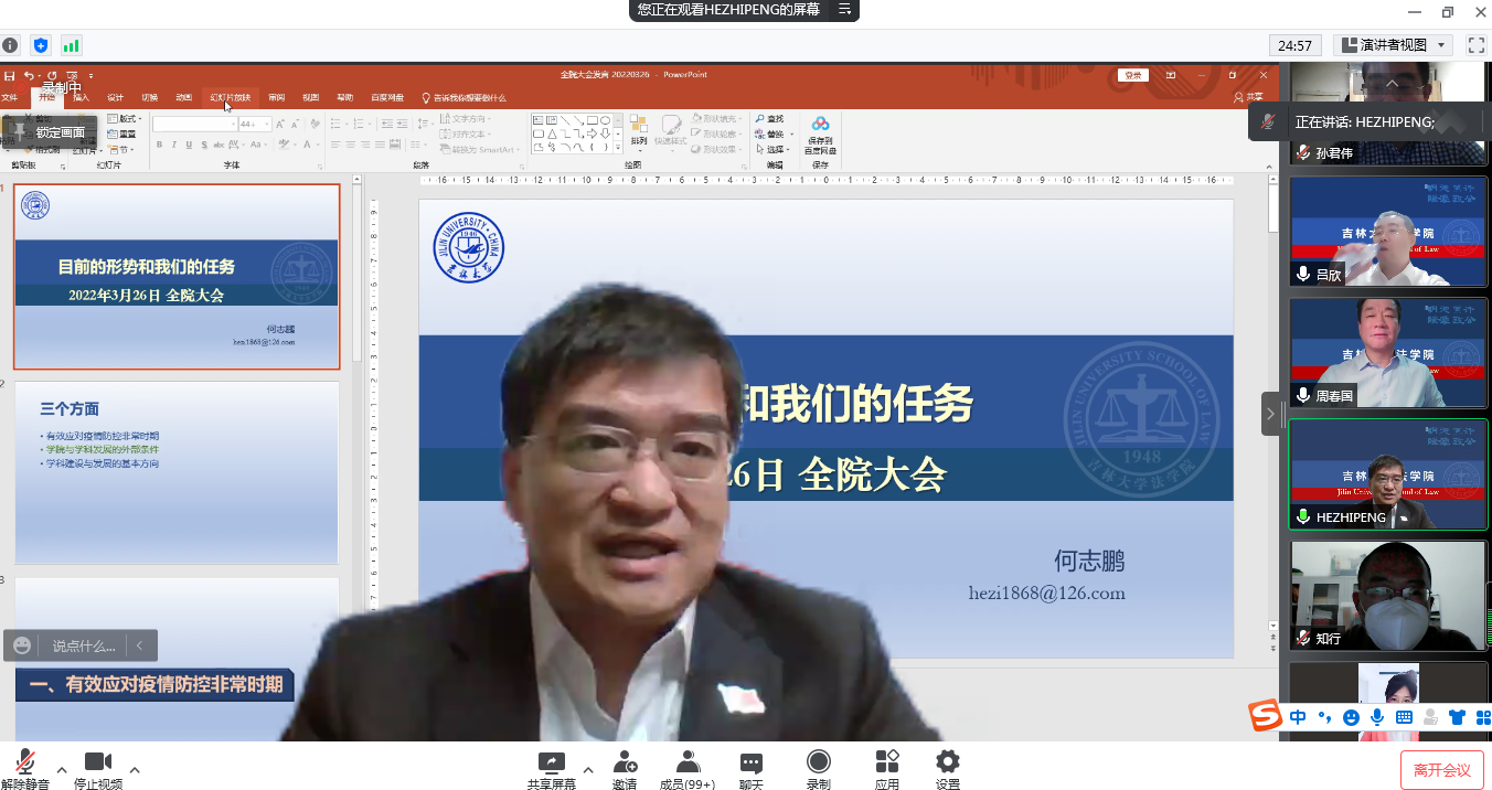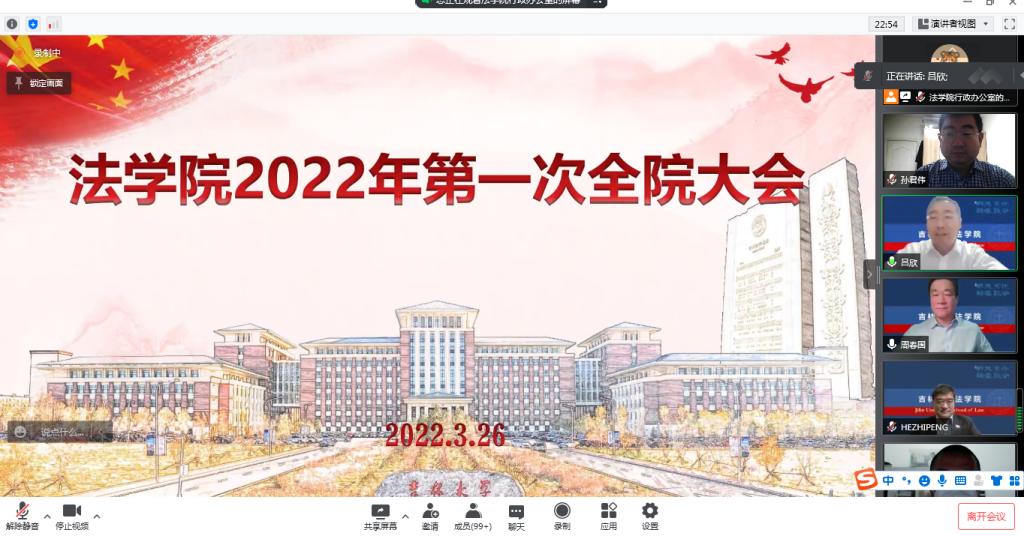 的工作安排,坚持实事求是地做好每日健康打卡;行政人员要带好头,做好管理和老师们服务保障工作,做好安全防火;辅导员要和老师们保持沟通,必须做到底数清楚,做到一人一策,一个不落。周春国嘱托全院教师,一定要与学生们同心、同向、同行,共同努力,用温情和付出打造吉大法学家园共同体,用真诚和爱陪伴学生们走过这段艰辛的心路历程。