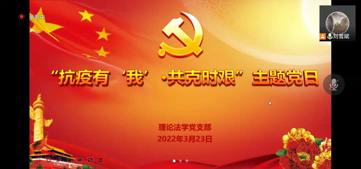 党委疫情防控期间的工作安排,于3月23日晚举办“抗疫有我·共克时艰”线上主题党日活动。支部成员刘雪斌、杜宴林、宋显忠、钱大军、苗炎、侯学宾、杨帆、郑怀宇、乔楠、黄伟、杨雪通过线上方式参加。主题党日活动由理论法学党支部书记刘雪斌主持。