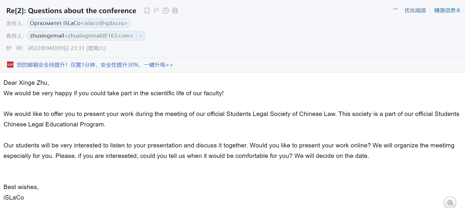 学生在会议上的精彩学术报告,给圣彼得堡国立大学的师生以及其他各国的参会学生留下了深刻的印象。会议结束后,朱欣格同学收到圣彼得堡国立大学的邮件,邀请她继续参与圣彼得堡国立大学极速赛车