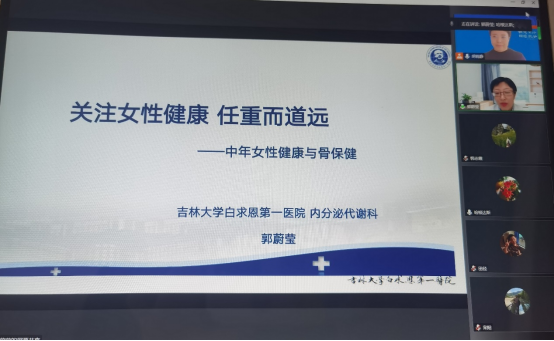 郭老师讲座的题目是“关注女性健康 任重而道远——中年女性健康与骨保健”。针对中年女性的特点,郭老师首先为大家讲解了女性生理周期及每个阶段的特点,特别是中年女性更年期的特点、身心发生的变化及对未来身体健康的影响,还介绍了MHT介入治疗的情况。之后,她又着重讲解了骨质疏松的问题,包括如何诊断辨别、如何防范保健和治疗等。郭老师的讲座深入浅出,不仅内容丰富,而且非常实用,既普及了健康知识,又澄清了大家的一些错误认识。郭老师强调中年女性要多关注自己的健康,但不要自己盲目用药,而是要经过专业机构诊断后对症治疗。最后,郭老师还就一些老师提出的问题进行了耐心解答。一个多小时的讲座让大家意犹未尽、收获颇丰。大家纷纷在聊天框里向郭老师表达了谢意,并希望以后能够有机会继续听郭老师详细讲解女性健康问题。
