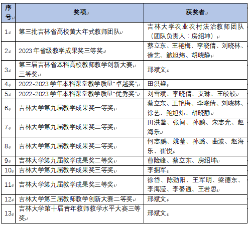 农业农村法治教师团队获得第三批吉林省高校黄大年式教师团队表彰;彭贵才教授、李洪祥教授获得从教40年荣誉徽章;蔡立东教授、王艳梅教授、李晓倩副教授、刘晓林教授、鲍旭炜老师、胡晓静教授共同获得2023年省级教学成果奖三等奖、极速赛车
