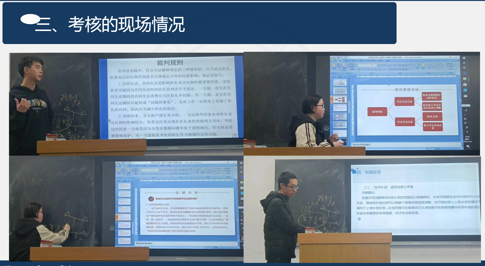 座谈会上,16位教师介绍了过程考核的相关做法和经验。各位老师结合课程和学生的具体情况,综合运用课堂提问、小组讨论、作业、论文等多种方式,在模拟法庭、案例研讨、法律文书写作、情景和角色代入、热点问题导入、翻转课堂、交叉融合、新兴领域等方面进行了探索。