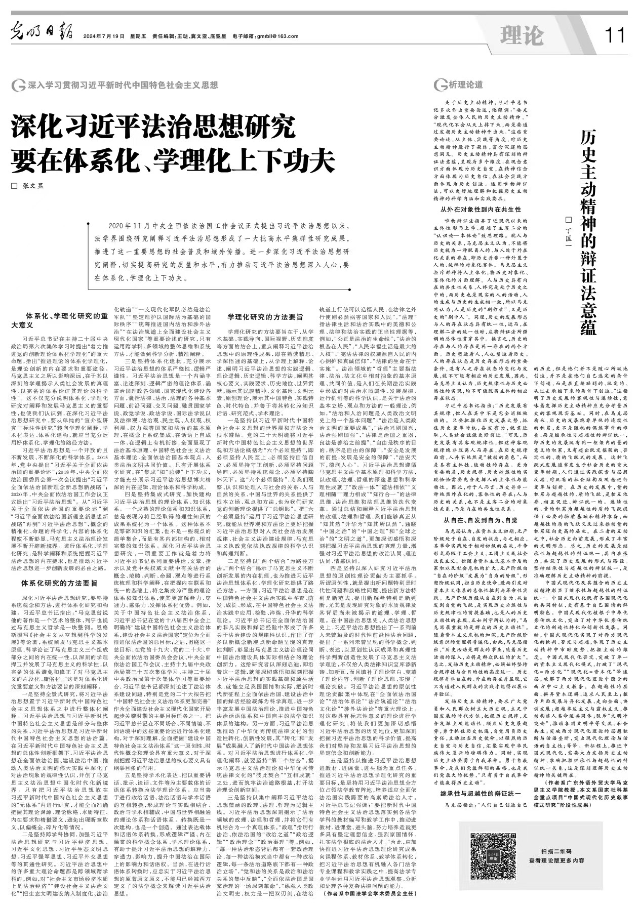 哲学社会科学资深教授、中央马克思主义理论研究和建设工程咨询委员会委员、教育部社会科学委员会法学学部召集人张文显在《光明日报》发表文章《深化习近平法治思想研究要在体系化、学理化上下功夫》。
