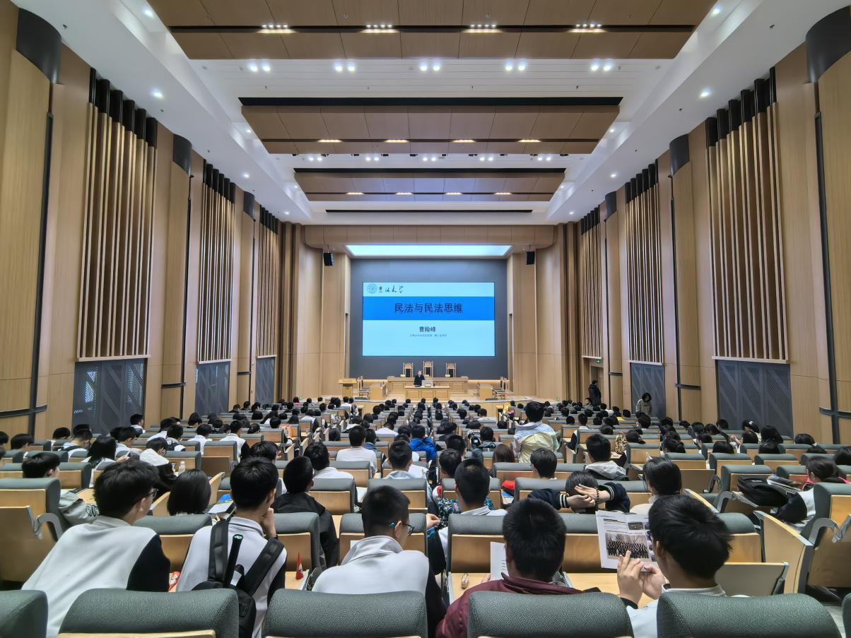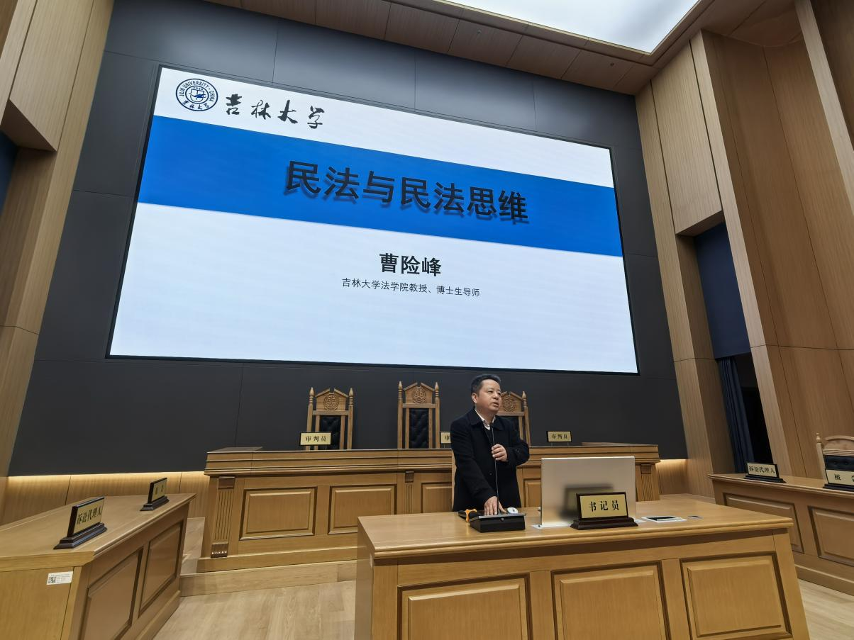 法学楼门前集合,在学生志愿者和带队老师的带领下参观了B101模拟法庭报告厅。在庄重宏伟的模拟法庭中,由曹险峰教授为同学们讲授了一堂以“民法与民法思维”为主题的讲座。曹教授以生动案例解析热点法律问题,深入浅出的讲解让晦涩的理论变得鲜活,尤其是流浪猫纠纷案的讲解让同学们重新审视责任、道德和法律的边界,逐渐理解法律判断并非非黑即白,法律不仅是冰冷的条文,更是守护社会秩序的规则基石。同学们对于高度还原法庭真实场景的教室倍感新奇,身临其境式的学习体验更加激发了同学们对极速赛车