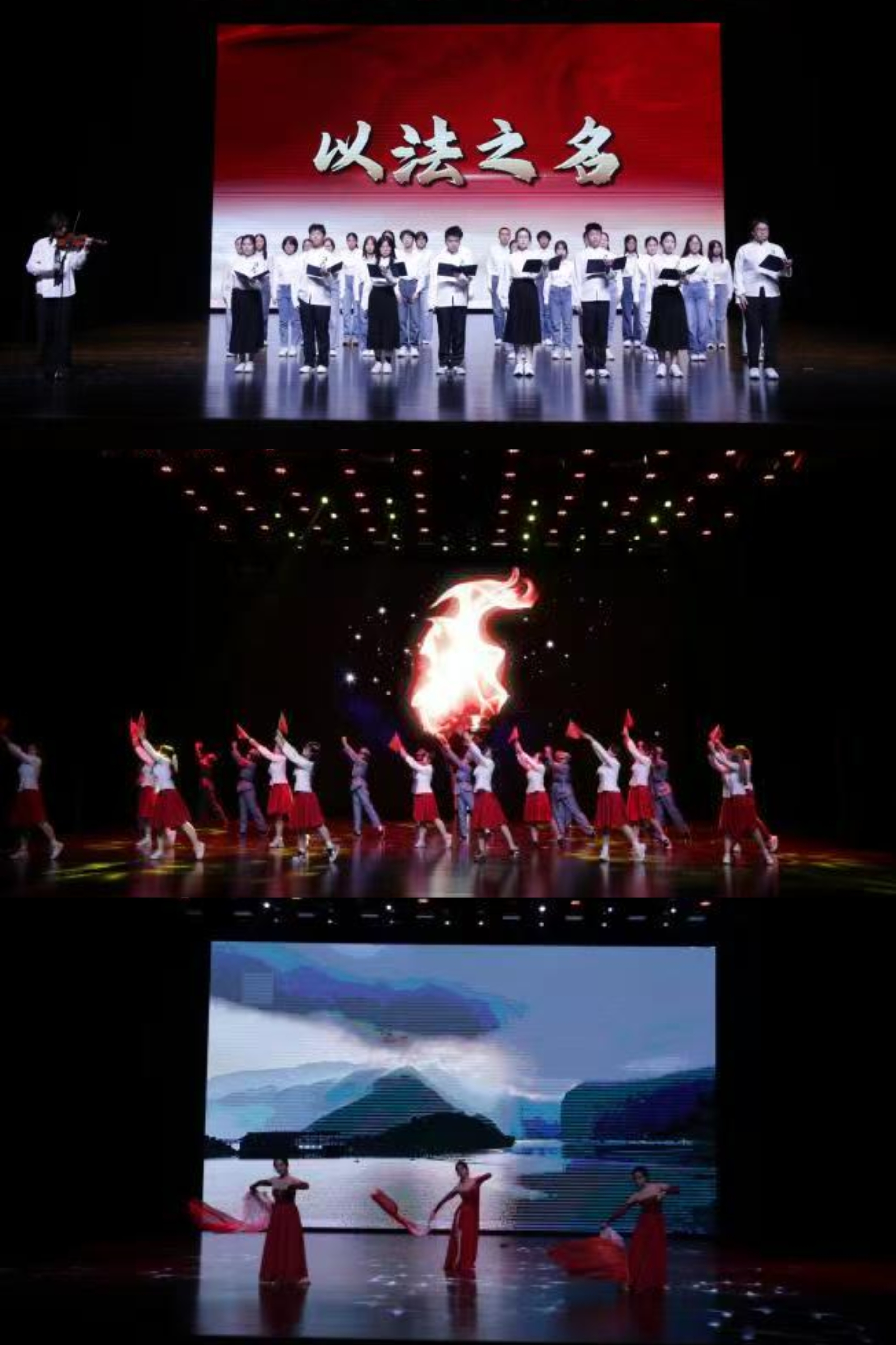 第二篇章“溯光·德润铸魂烈”聚焦红色精神与文化传承。情景舞蹈《薪火共生》贯通历史与现实,生动诠释了东北抗联精神与新时代青年的使命传承。古典舞《浮光》从美学视角彰显文化自信。朗诵与小提琴合奏《以法之名》则庄重表达了吉大法学人响应党的二十届四中全会精神、投身法治建设的坚定信念。