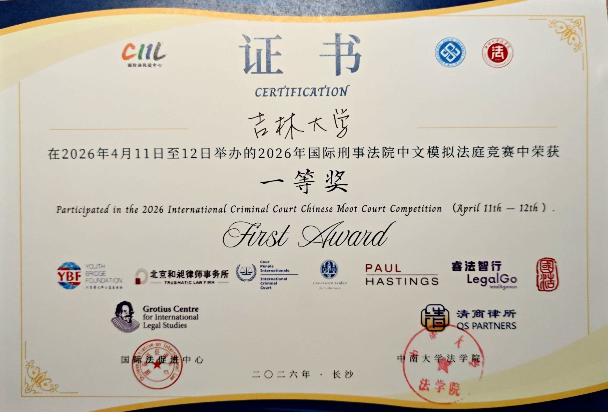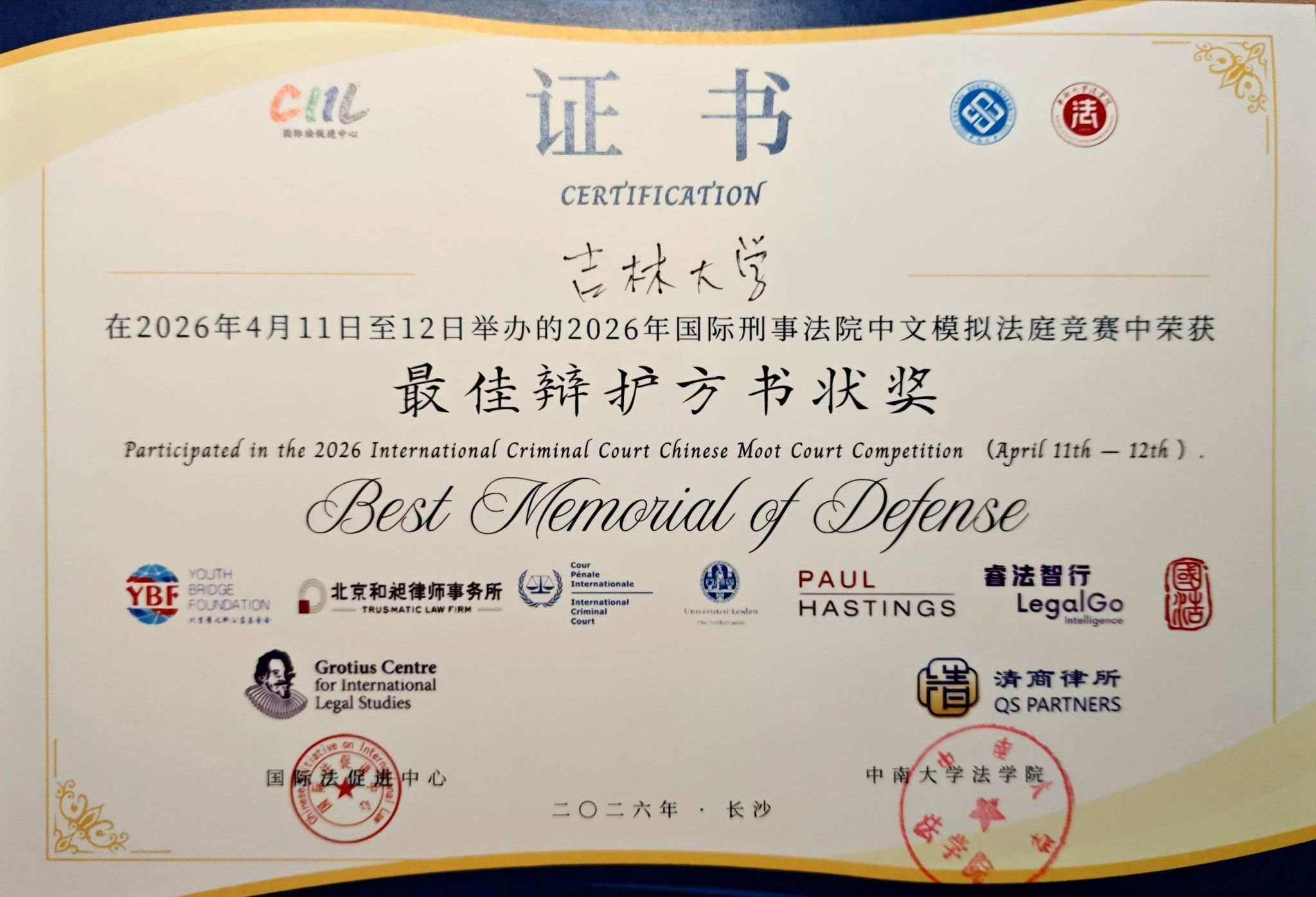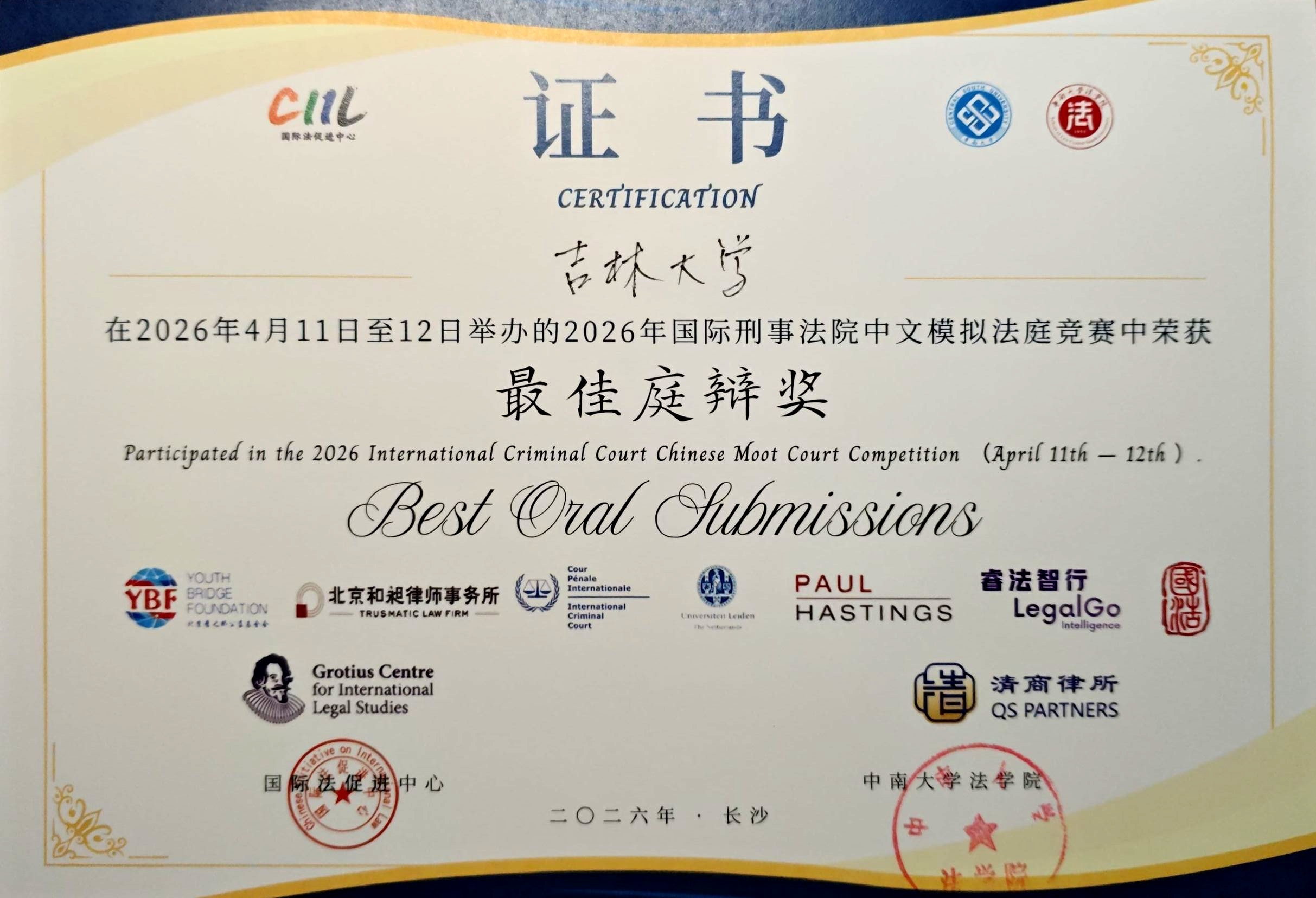 2026年4月11日至12日,2026年国际刑事法院中文模拟法庭竞赛在中南大学潇湘校区举办。本届赛事共吸引了130支代表队参与,参赛队伍数量再创历史新高。本项赛事由中国国际法促进中心与国际刑事法院协办,要求参赛各队围绕国际刑事法院属地管辖权、攻击人道主义援助的战争罪、非缔约国国家元首豁免权、非法移交等核心争议焦点撰写书状、进行庭辩。