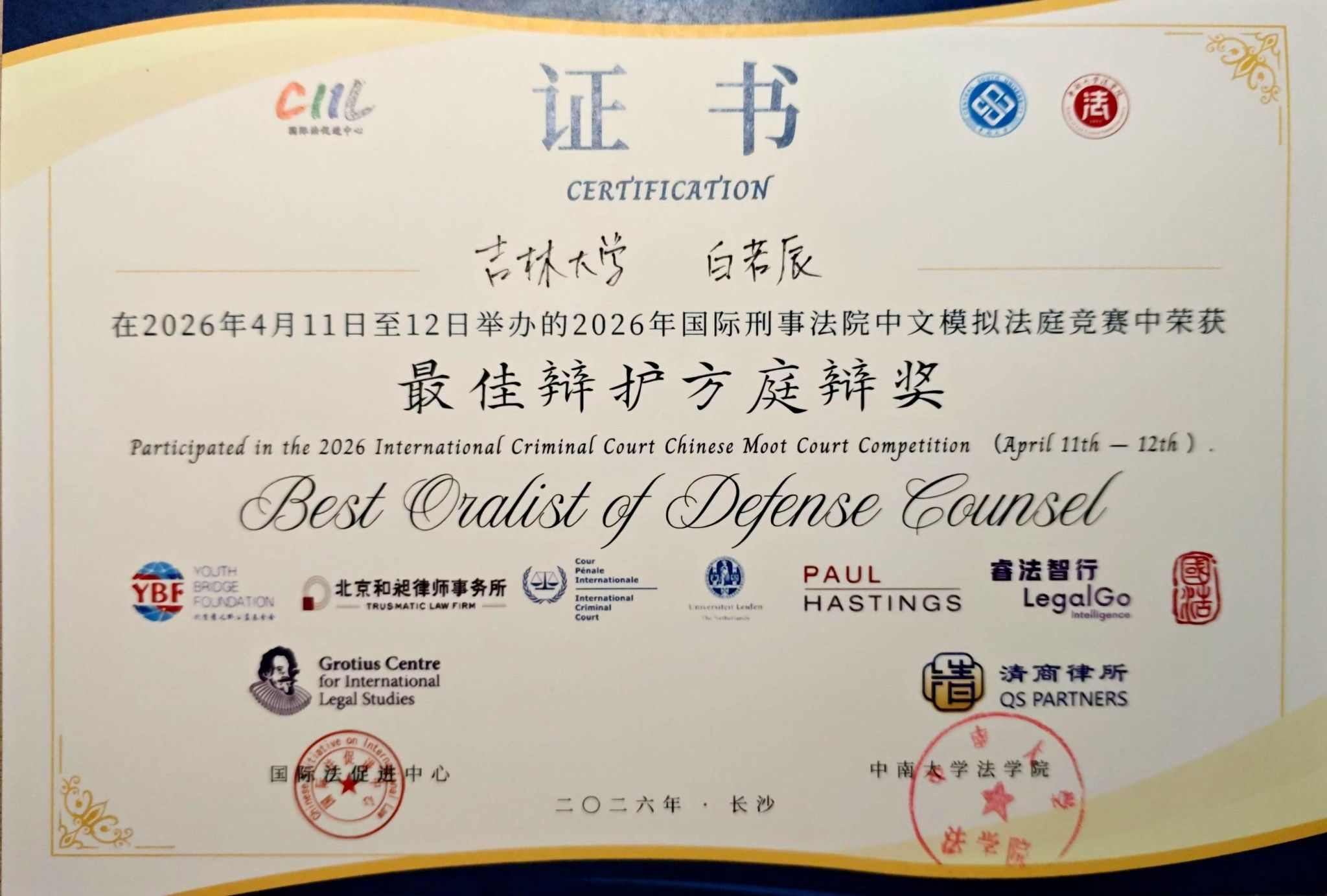 本科生白若辰表现突出,荣获最佳辩护方庭辩奖。