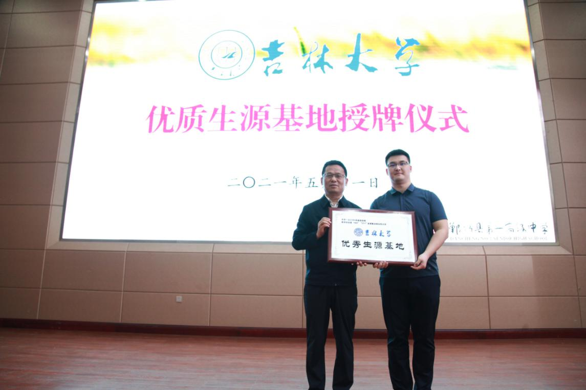 授予郸城县第一高级中学优秀生源基地标牌,与党委书记、校长刘成章握手致意并合影留念。