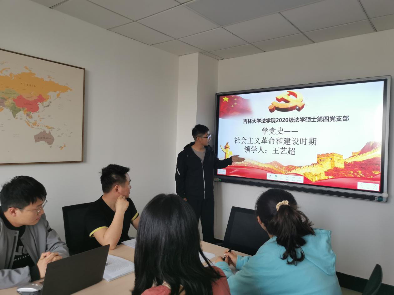 习近平总书记指出,我们党的一百年,是矢志践行初心使命的一百年,是筚路蓝缕奠基立业的一百年,是创造辉煌开辟未来的一百年。回望过往的奋斗路,眺望前方的奋进路,必须把党的历史学习好、总结好,把党的成功经验传承好、发扬好。为落实习近平总书记讲话精神,2021年5月19日2020级法学硕士第四党支部在东荣710-2会议室举行了以“奋斗百年路,启航新征程”为主题的党史学习教育。本次学习的时期是“社会主义革命和建设时期”。由王艺超同志领学,2020级法学硕士第四党支部党员以及部分同学共同参加。