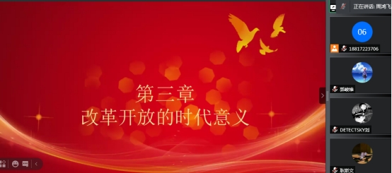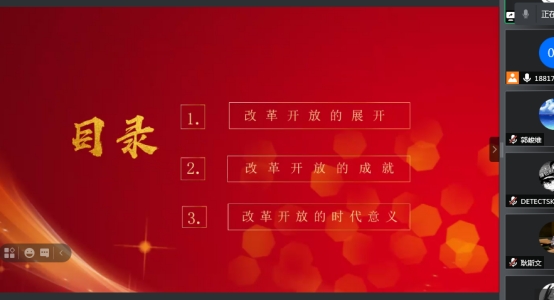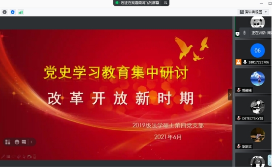 2019级法学硕士第四党支部在腾讯会议开展了以“改革开放新时期”为主题的线上党史学习集中研讨活动。会议由支部书记李昕冉主持,党宣传委员周鸿飞担任领学人,其他支部党员和发展对象出席并参与了这次活动。