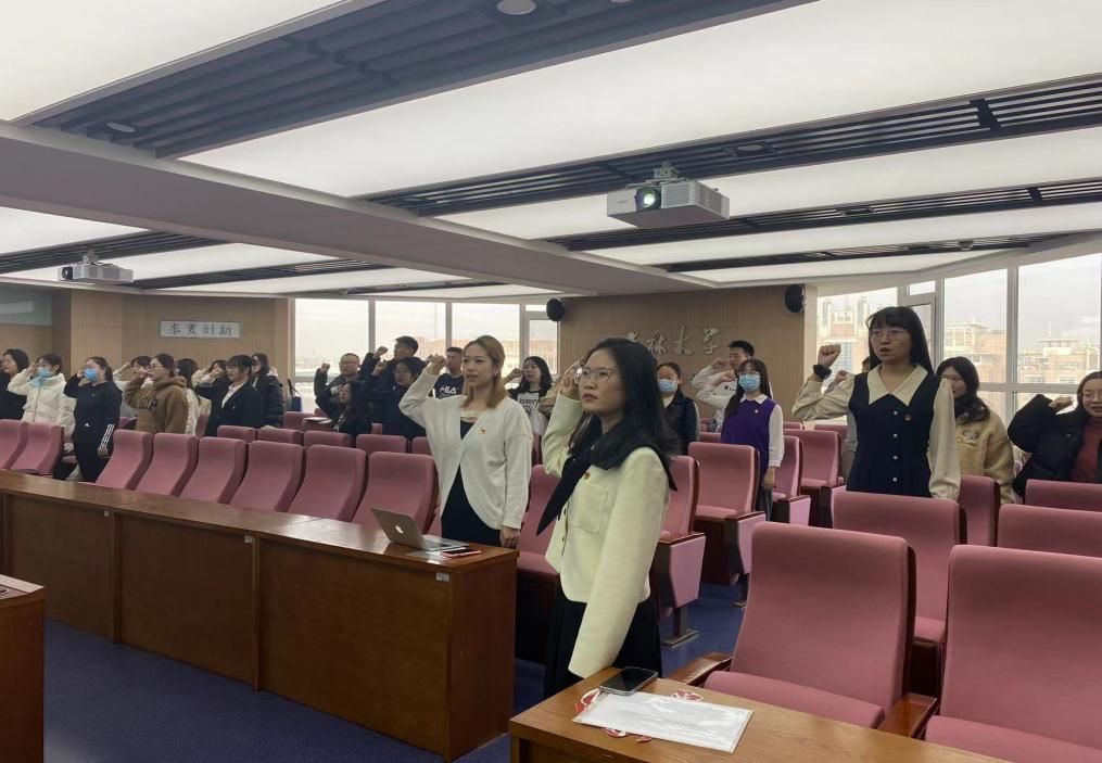 重温入党誓词,感受信仰力量。法学硕士第二党支部石湫雨同志带领大家面对庄严党旗庄严宣誓,重寻入党初心:“我志愿加入中国共产党,拥护党的纲领,遵守党的章程,履行党员义务……随时准备为党和人民牺牲一切,永不叛党。”鲜艳的五星红旗和胸前的党徽交相辉映,字字句句叩击全体党员的心灵,让大家永远牢记使命,永葆奋进之志。