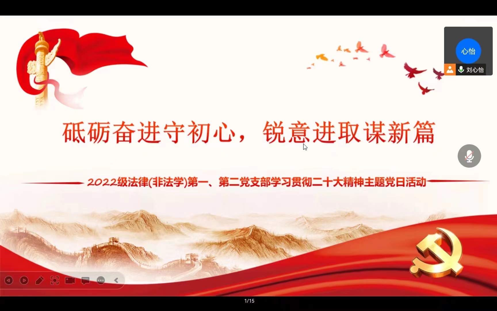 各项活动。加强学习,坚定信心,奋勇前进,以此为起点不断前行。第一党支部书记刘心怡同志表示:党的二十大胜利召开标志着新征程的开启,听党话跟党走,自信自强,踔厉奋发,厚植家国情怀,抓住大好时光,将青春融入党和人民的事业,生逢今日之中国,在实现中华民族伟大复兴的征程中,贡献自己的青春力量,实现自己的人生价值。