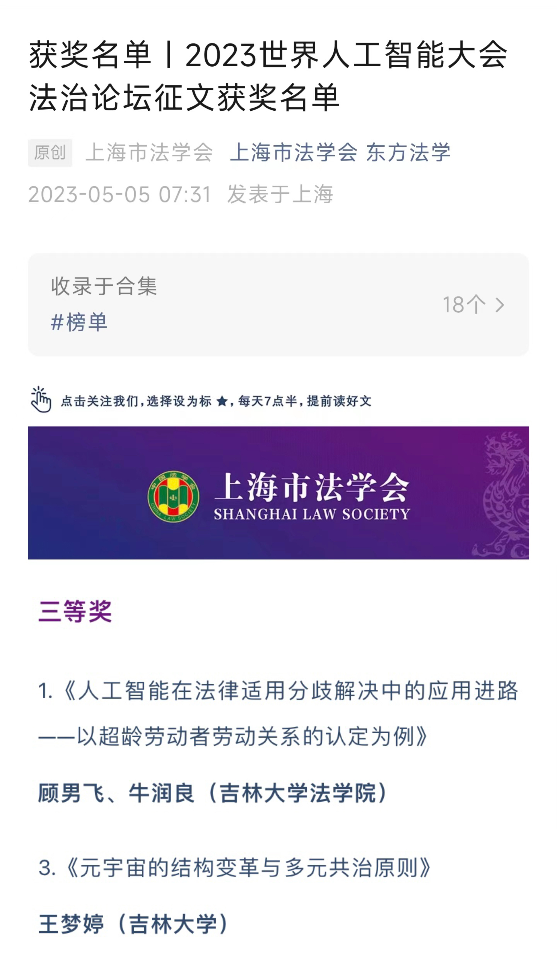 2022级博士研究生牛润良共同写作的《人工智能在法律适用分歧解决中的应用进路——以超龄劳动者劳动关系的认定为例》荣获三等奖,2021级法律(法学)专业研究生王梦婷写作的《元宇宙的结构变革与多元共治原则》荣获三等奖。
