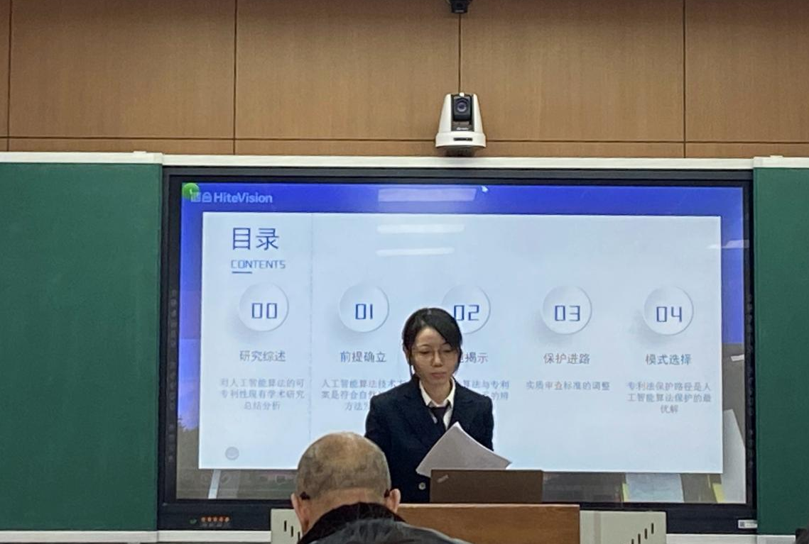 第二组同学讨论了人工智能算法的可专利性以及专利侵权中禁止反悔原则的适用等问题。在评议环节,老师指出专利法领域的文章应当回归专利法本身,避免过度技术化的问题。老师肯定了部分同学的选题,但也指出各同学论文存在的问题,如缺乏实证依据、问题堆叠、题目不够精确和用语专业性不足等。