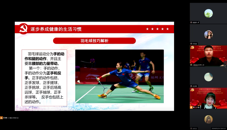 铆足干劲强体魄,党建引领启新篇。为丰富研究生业余生活,发挥朋辈力量聚焦日常生活谈心解惑,围绕各支部党员、积极分子们反馈较为关心的话题进行“党建+健康”微讲座,研究生代表常仁邦、关呈琳两位同学分享自身参与马拉松、羽毛球赛事的宝贵经验,激励研究生们以更加向上的人生态度和更加良好的身心状态投身伟大实践之中。