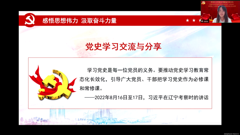 感悟思想伟力,汲取奋斗力量。全体党员和积极分子共同观看党史教育宣传片。随后,2022级法学硕士第一党支部书记徐晗婷针对《党史学习教育工作条例》中的重要内容讲授专题党课,引导研究生党员和积极分子学好、用好党史这本“生动教材”。各党支部选派代表分享自身党史学习的心得体会。以深入交流激发学习热情,鼓励全体参会人员从党史学习教育中汲取智慧、积聚力量。