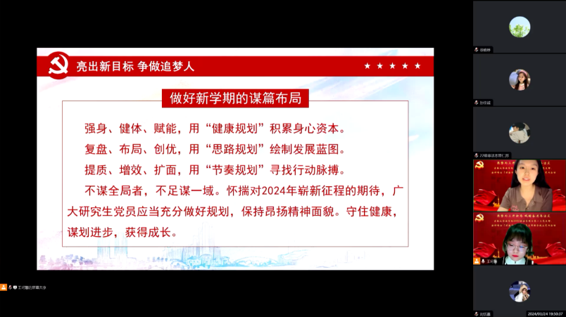 亮出新目标,争做追梦人。2022级法律硕士(非法学)第一党支部刘心怡组织全体参会人员进行个人总结剖析,用“思路规划”绘制发展蓝图。认真规划新学期,设置线上留言板,全体党员、积极分子共同写下愿景,寻找新一年学习科研以及思政学习的增量处,在新学期昂扬奋进,力求再建新功。