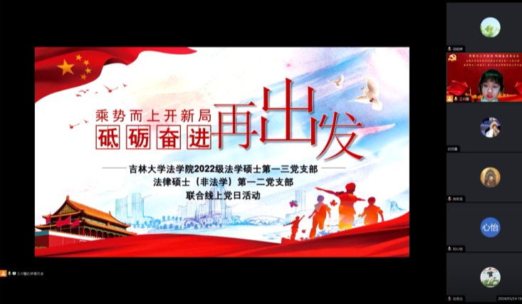 2022级法学硕士第一党支部、法学硕士第三党支部、法律硕士(非法学)第一党支部、法律硕士(非法学)第二党支部联合组织开展“乘势而上开新局 砥砺奋进谱新篇”主题党日活动,引导研究生党员将激扬青春的热情和干事创业的精神融入学习生活、化为行动力量,在勤奋学习、实干笃行中创造实绩、扬帆远航。本次活动由2022级法学硕士第三党支部书记王珂馨主持。