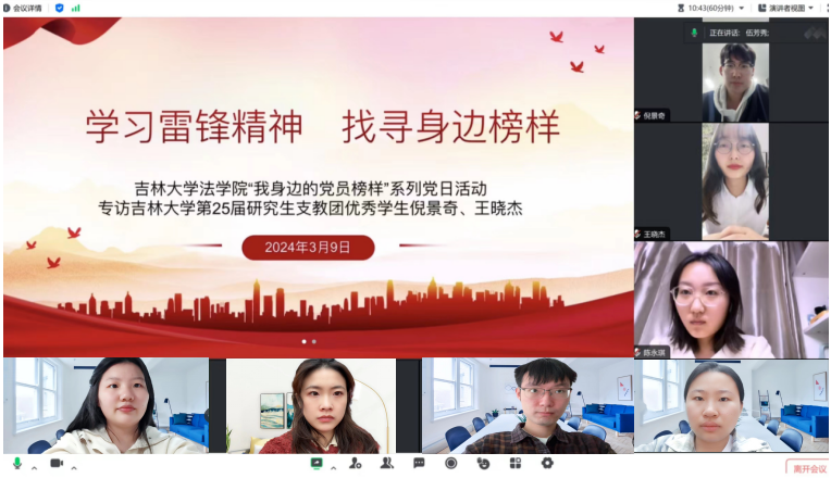 传承雷锋精神,发挥榜样力量。2023级法学硕士四个支部组建采访团队,充分挖掘身边党员榜样,号召广大研究生党员学习典型、弘扬先进,向榜样看齐。2023级法学硕士第一党支部采访到李方正、邱大钊、田欣岳三位学生党员代表。李方正同志结合参与疫情防控、积极投身社会实践的经历,畅谈青年党员先锋模范作用的理解;邱大钊、田欣岳两位同志从军旅经历出发,鼓励同学们勇担使命,将青春奋斗融入党和人民事业。第二党支部采访到学生党员石尚。石尚同志回顾入党初心,提出青年党员应珍惜当下,不断夯实专业基础、锤炼本领。第三党支部线上连线极速赛车