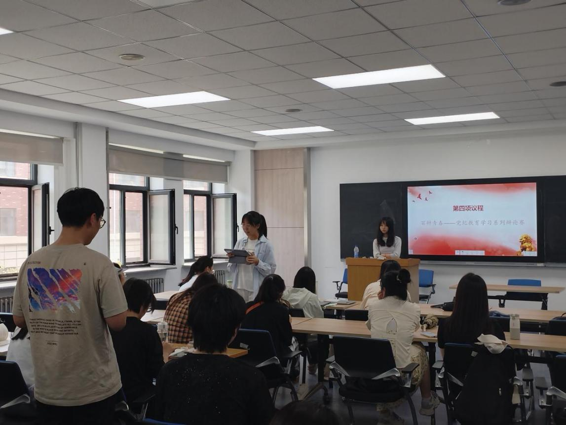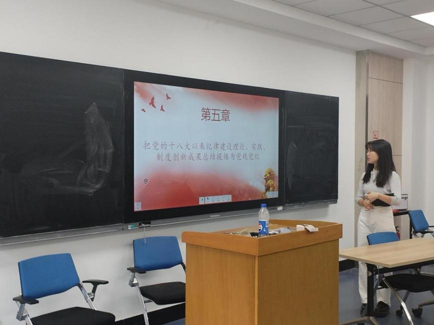 观看纪录片后,由支部书记尹晓晴同志带读学习《中国共产党纪律处分条例》。尹晓晴为参会研究生详细介绍了《条例》的制定背景和深远影响。支部党员和积极分子共同朗读条文,同时有针对性地进行观点交流。以原原本本学、逐章逐条学的方式,把准矫正党员日常行为的标尺。加强共学联学交流,力求准确掌握的基础上进一步拓展党纪学习教育成果。