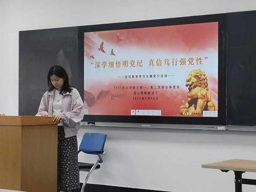 2023级法学硕士第一、第二党支部于敬信楼法学基地D207联合开展“深学细悟明党纪,真信笃行强党性”党纪学习教育主题党日活动。本次活动由2023级法学硕士第一、二党支部学生党支部书记文卓、尹晓晴共同主持,第一、二党支部全体党员以及入党积极分子参加。