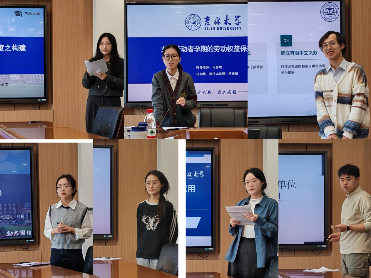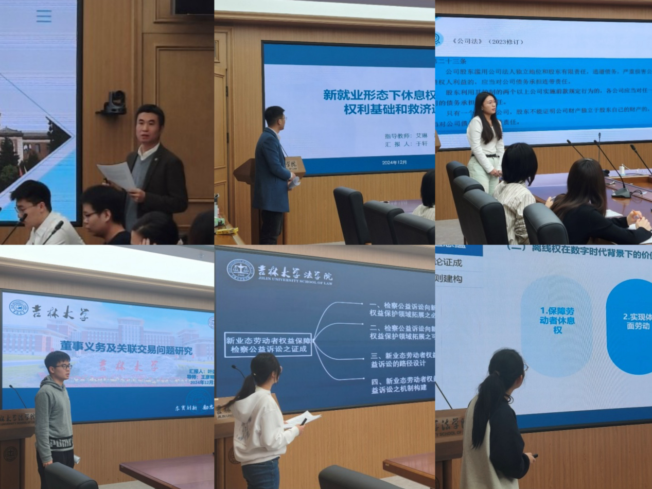 陈佳委同学以“新公司法下法定代表人越权担保效力认定问题探讨”为题,陈露元同学以“一人公司人格否认制度的纵向扩大适用研究”为题,陈智伊同学以“新公司法股东失权制度的适用困境及完善建议”为题,廖艳茹同学以“关联交易正当性认定规则研究——从新《公司法》的修订切入”为题,卢扬同学以“公司机会规则的立法完善研究——以《公司法》修订为视角”为题,张潇桐同学以“独立董事勤勉义务判定标准认定研究”为题,蔡佳诚同学以“人口老龄化背景下退休再就业人员劳动权益保障的现状与优化对策研究”为题,陈一鸣同学以“新业态从业人员多层次工伤保险制度构建”为题,霍艺鑫同学以“远程办公从业者工时权益保障”为题,黎家美同学以“劳动者离线权保护路径探究:以工时制度为视角”为题,宋楠楠同学以“新就业形态下劳动者离线权的建构进路”为题,谢莹莹同学以“新就业形态劳动者的失业保险制度探析”为题进行汇报。
