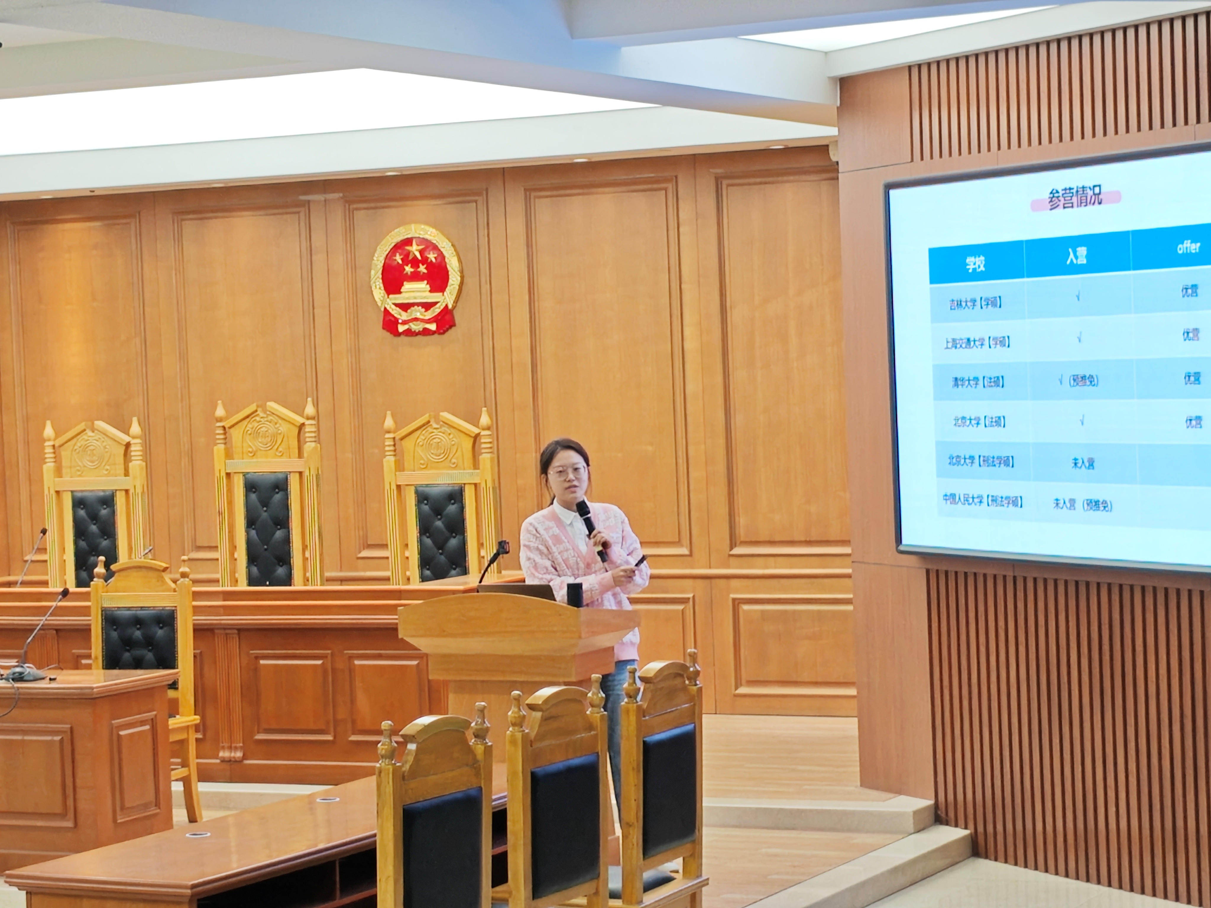 王一涵同学以“乘风破浪,砥砺前行”为主题,介绍了个人情况以及参营情况。她结合自身保研过程,详细地介绍了几个院校的考核流程和注意事项,给出以不变应万变的策略:即以民法、刑法为基,其余科目根据目标极速赛车