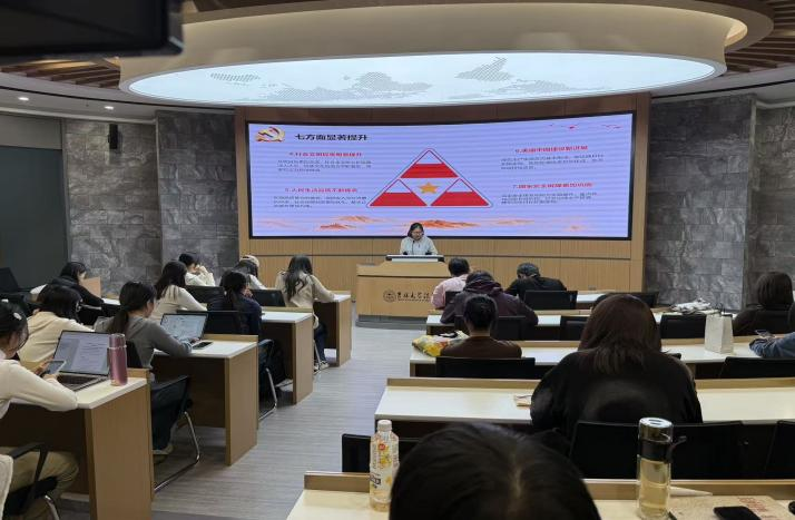 锚定十五五目标,凝聚奋进前行力量。2025级法律硕士(非法学)第二学生党支部书记李雨纯聚焦“十五五”规划总体定位与发展目标作专题宣讲。她明确“十五五”时期(2026年至2030年)是基本实现社会主义现代化的冲刺阶段,详细阐释了高质量发展、科技自立自强、深化改革、民生保障等七方面“显著提升”的核心目标,以及建设现代化产业体系、强化科技自立自强、建设强大国内市场等六大战略任务,为党员们清晰勾勒了未来五年的发展路径与实践方向。
