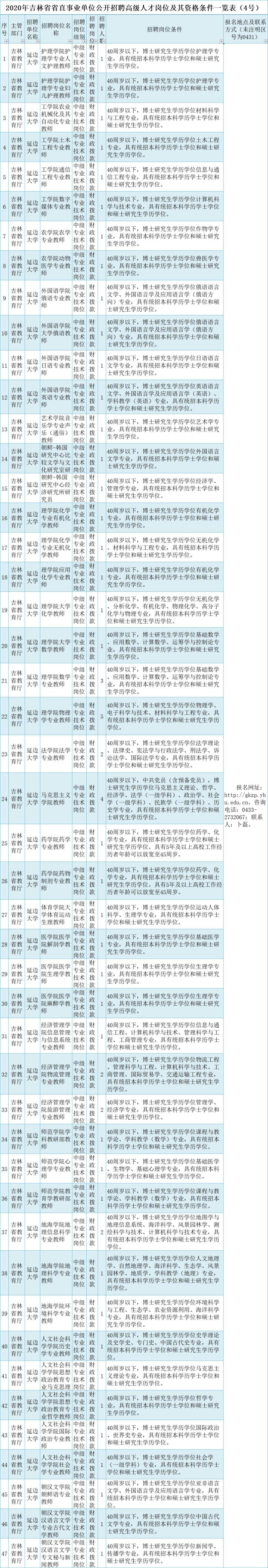 本公告共招聘高级人才73名,具体招聘岗位及条件详见《2020年吉林省省直事业单位公开招聘高级人才岗位及其资格条件一览表(4号)》