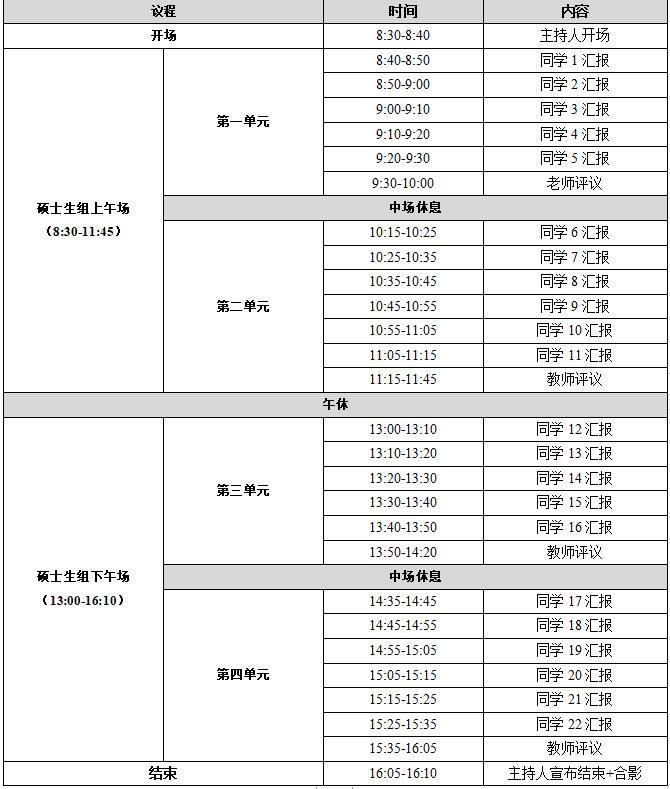 一个评审单元学生汇报完毕后,评议教师统一评议。硕士生组各教师每次评议时间≤7分钟,每个单元总评议时间≤30分钟。