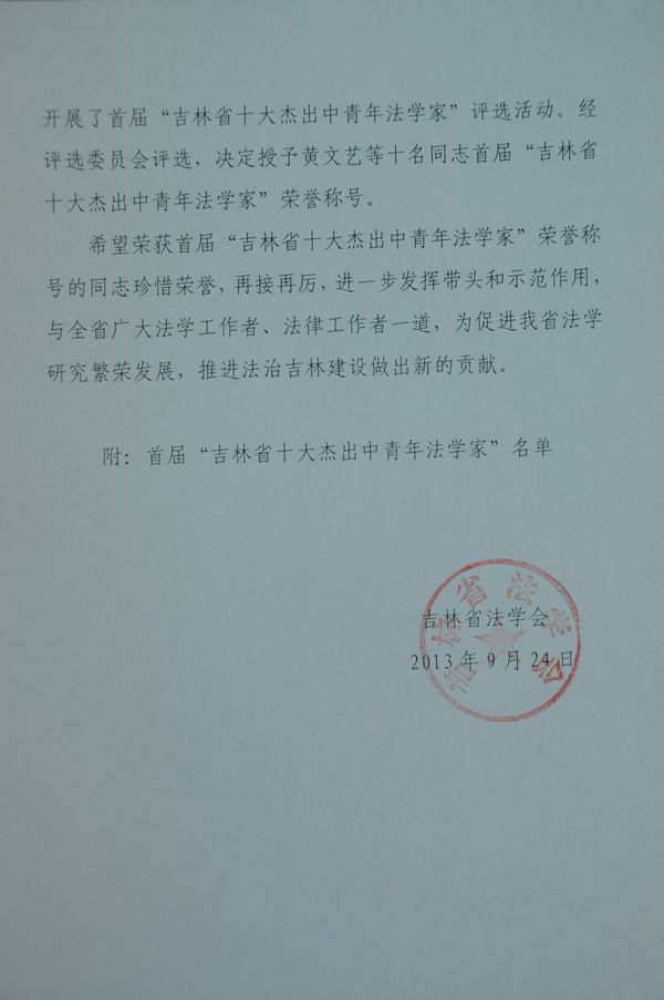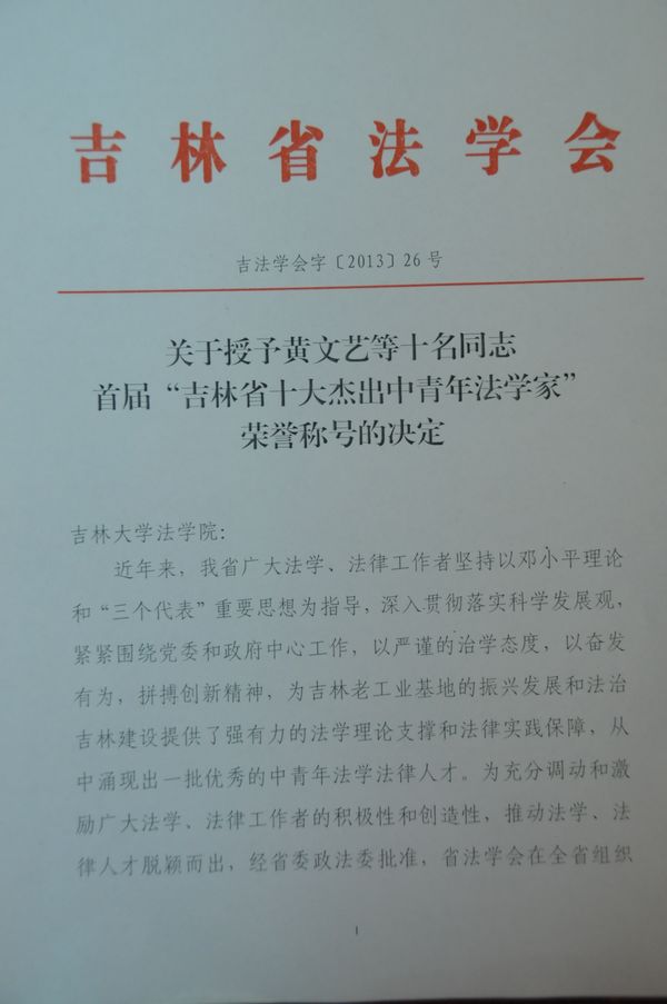 经评选委员会评选,吉林省法学会于2013年9月24日作出《关于授予黄文艺等十名同志首届“吉林省十大杰出中青年法学家”荣誉称号的决定》。极速赛车