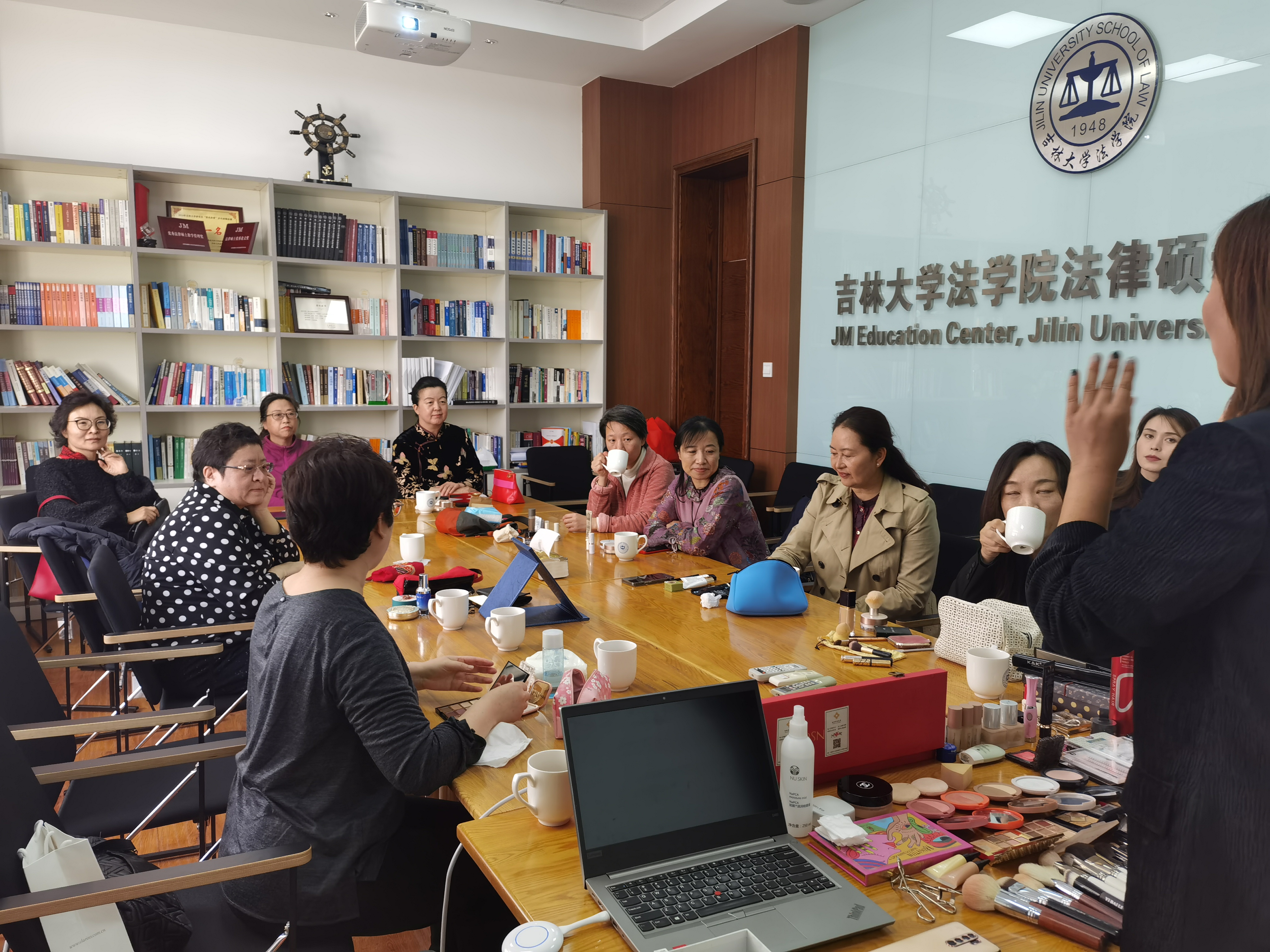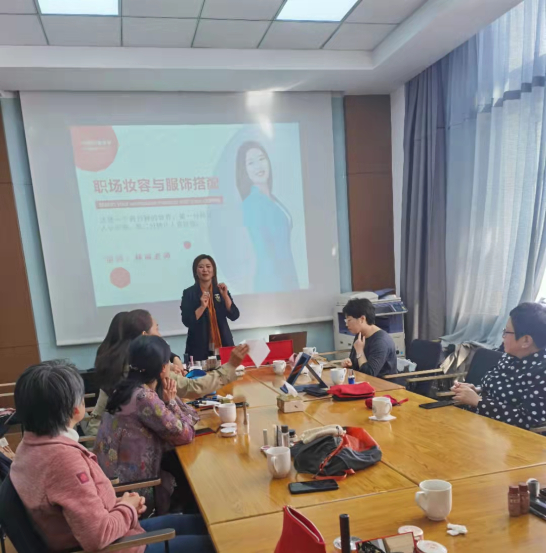 女教师组织了一场通俗易懂、内容丰富的关于生活美妆及配饰的讲座。林丽女士有二十多年的美妆从业经验。她精心准备了PPT,从肤质的区分、产品的选择、生活妆的基本技巧等多个方面为大家进行了讲解。