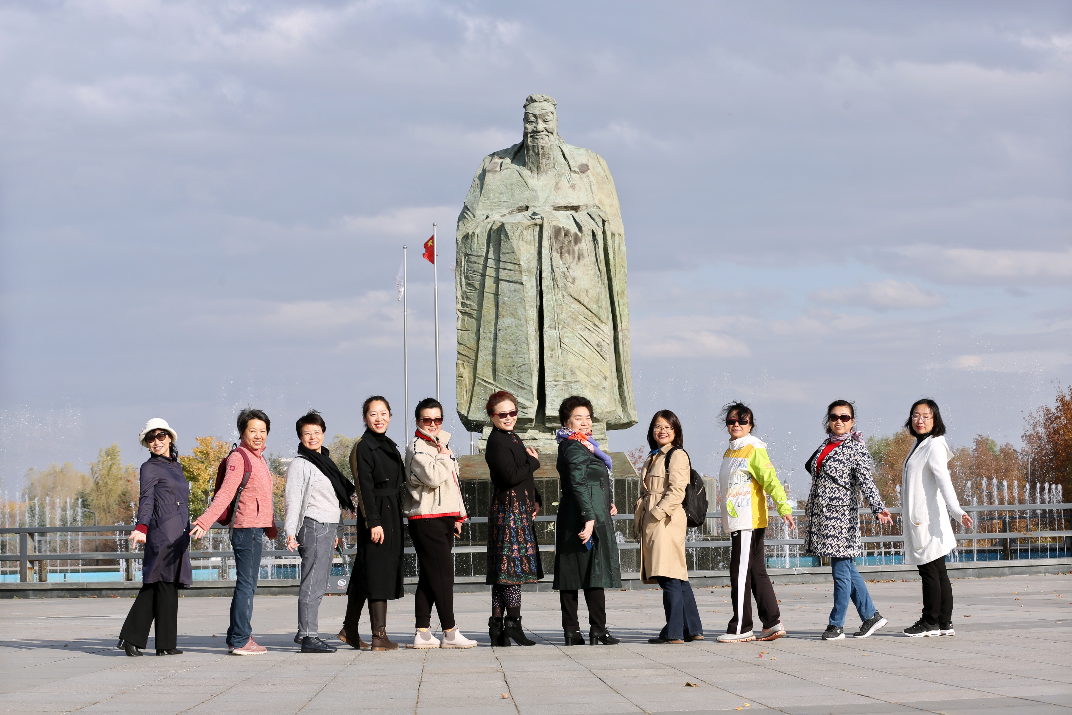 长春雕塑公园是一个汇聚当代雕塑艺术、展现世界雕塑艺术流派的主题公园,是长春市的一个地标性公园。在这里,不仅可以欣赏到随处可见的形态各异精美雕塑艺术品,还能在树木湖水间感受到自然之美。大家在雕塑公园孔子雕像处集合,热爱摄影的任喜荣老师首先给大家讲解了自己感悟的摄影技巧。她从水平、比例、焦点、干净、结构、主体、透视和修图八个方面给大家介绍了摄影小窍门,让大家受益匪浅。性急的老师马上开始实践,将拍出的照片发在群里“炫耀”。大家走走停停,随行的摄影师不时捕捉精彩瞬间,或者指导大家摆拍“艺术照”。在红色、黄色、绿色的秋叶的掩映下,静默的雕塑也仿佛有了生气和灵魂,愈发散发出艺术的迷人气息。大家不停地举起手机,用镜头留下这一刻的美丽,用心享受这一刻的休闲,陶醉在这秋日秋景中。