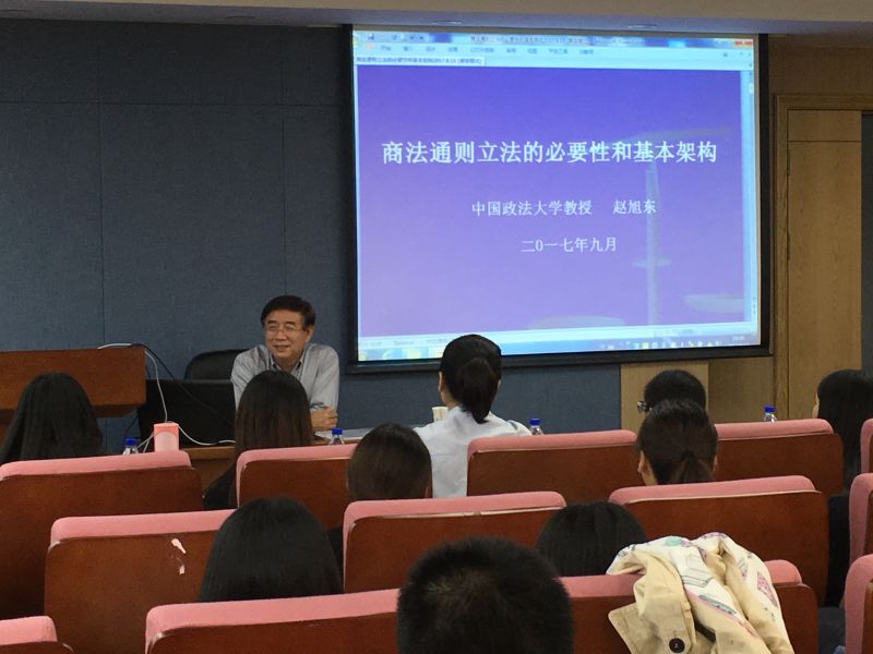 赵旭东教授从商法通则立法必要性、可行性和有利条件、商法通则的基本架构等三个方面阐述了讲座主题。