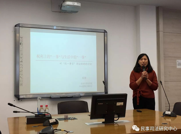 民诉法学博士研究生袁琳应邀做了题为《权利上的“一事”与生活中的“一事”——对“同一事实”诉讼标的的讨论》的学术讲座。