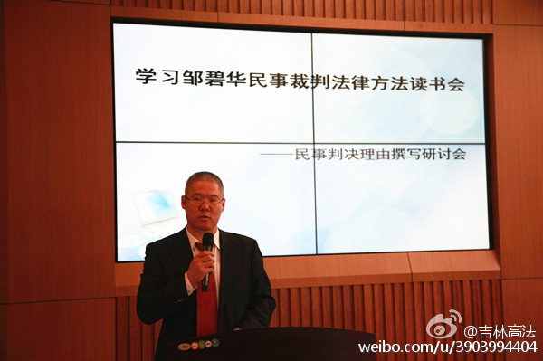 下午继续进行的是法律适用方法实务研讨,主题发言人均是省内各法院一线的法官们。吉林省高院民一庭副庭长姜涛法官首先发言。他提出在一定地域范围内法律职业者应当形成一个职业共同体,因而邹碧华法官的法律适用方法不应当仅仅适用于法官的司法裁判过程,检察官、律师乃至极速赛车