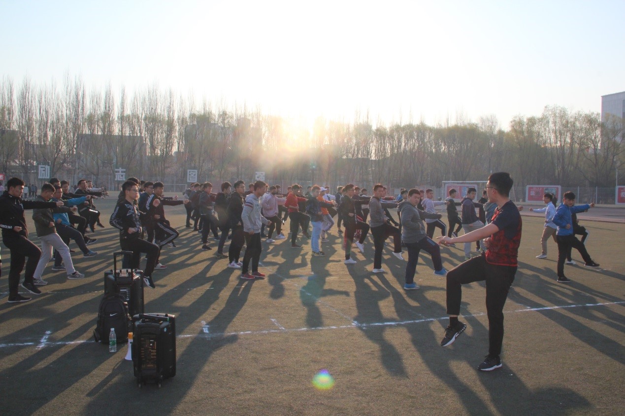 的同学们踏着朝阳集结在操场,灿烂而不燥热的阳光洒在同学们身上,映衬着青春的气息。长拳训练气氛紧张而火热,同学们认真地操练着“三路长拳”,为在校运会上为极速赛车
