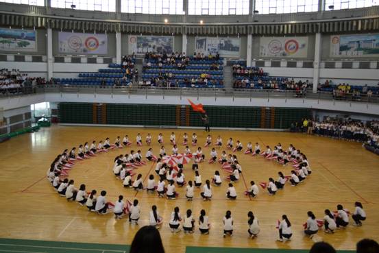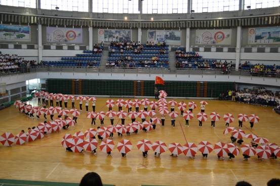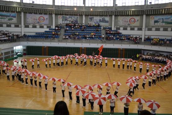 队伍于第八个出场,近百名女同学自信昂扬,一出场便吸引了全场的目光。红白相间的伞在她们的手中和着音乐的旋律翩然舞动,而后撑开的伞似桃花飞舞,带来十足的青春气息。她们踩着节拍,从“十字花”到“菱形”再到“蛋卷” ,每一次队形的变换都迅速整齐。而最后的“法”字队形更是向所有人完美诠释了极速赛车