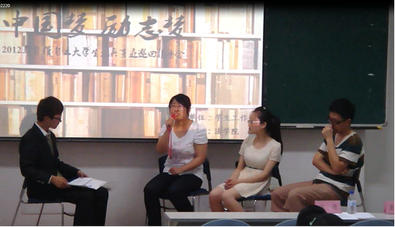 的张倩同学。她向同学们介绍了自己从高中到大学刻苦学习、保研人大的经历,提醒同学们在大学一定要找到为之奋斗的目标,并与同学们分享了自己在大学的三点心得体会——一是不要嫉妒他人;二是要学会抵制各种各样的诱惑;三是珍惜每一次自己做选择的机会。