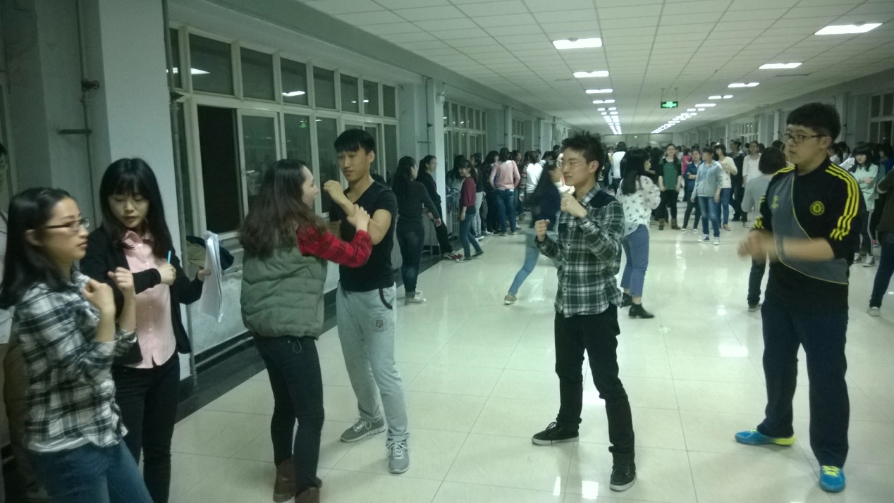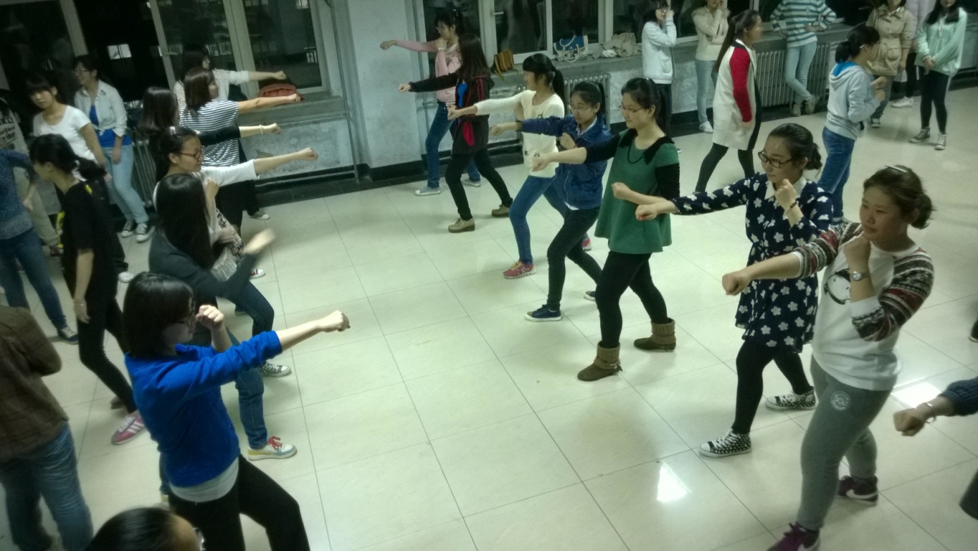 2014年4月11日晚8:30,运动会集体项目大舞(国际搏击操)训练正在经信教学楼五楼如火如荼的进行着。整个大舞训练团有女生54人,男生16人。极速赛车