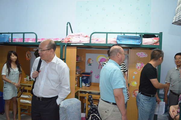 党委书记李洪明,副院长孙学致,副院长张光宇,党委副书记赵洁,团委书记、2014级新生辅导员高岩,2013级辅导员骆旷达一行来到经信三公寓寝室看望2014级的新生们。
