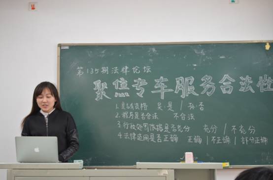 二班承办,同学们参与热情极高,13级二班和14级二班的大部分同学都参加了本期论坛。在选题上,二班同学也别出心裁,打破了以往选择刑事或民事案例的惯例,而是选择了“中国第一专车案”这一涉及行政法的案例。本次论坛邀请了擅长行政法的鲁鹏宇老师为大家进行指导。