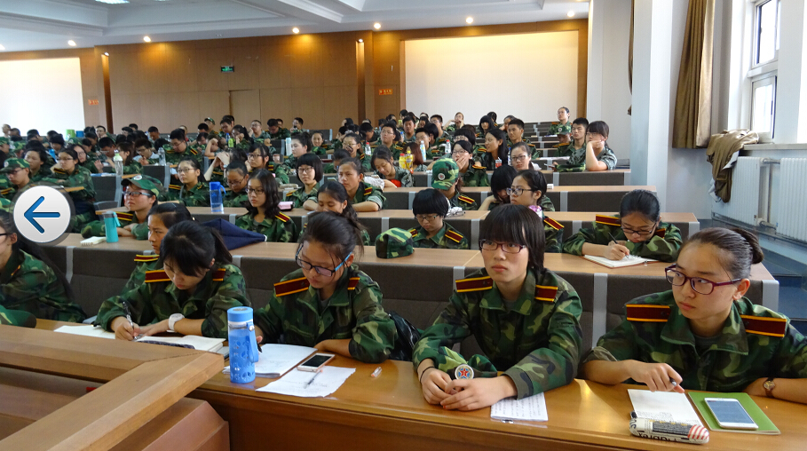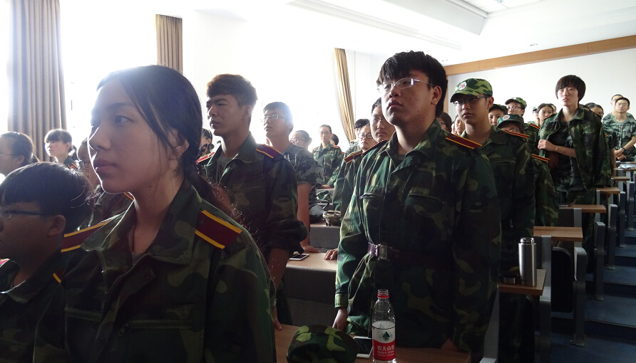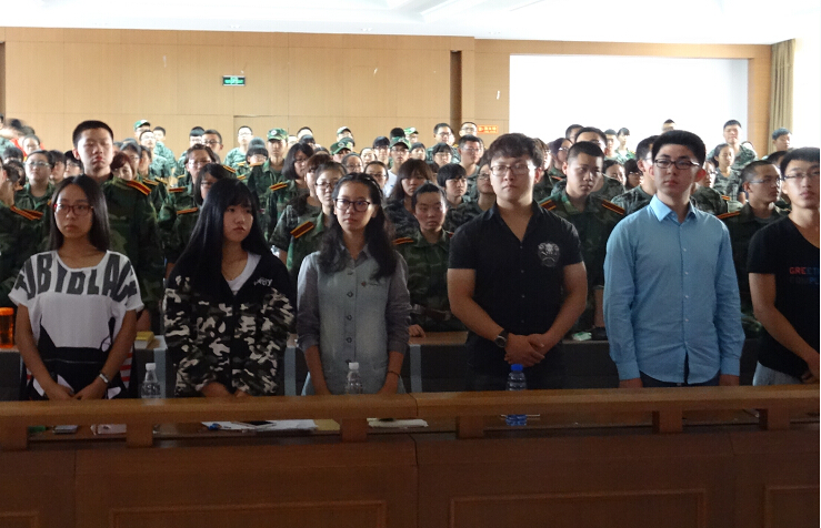 组织15级新生观看阅兵仪式的现场直播。在悬挂着国徽的三教五阶,身着军训服的新生们聚精会神,斗志昂扬,同步观看着令人热血澎湃的时刻