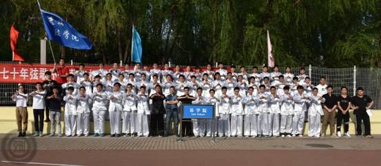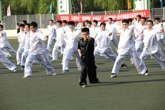学生昂扬向上的精神风貌。在上场之后,身着白色武术服的队员们分七列每列八人呈方队站立,两个身着黑色武术服的领队站在方队前部。随着长拳配乐的开始,队员们立即抖擞精神,动作一致。“弹腿冲拳”、“大跃步前穿”、“叉步亮掌侧踹腿 ”等等,每一招都做得十分到位,尤其是在做“腾空飞脚”这一动作时,队员们纷纷跳起,动作整齐划一。随着配乐的一声“收势”,队员们结束了整套动作,然后又踏着整齐的步伐离场。在之后的一组参赛队完成比赛之后,全部参赛队伍一起排起了队形,又共同将长拳表演了一遍,场面十分宏大,引得路人纷纷驻足观看。