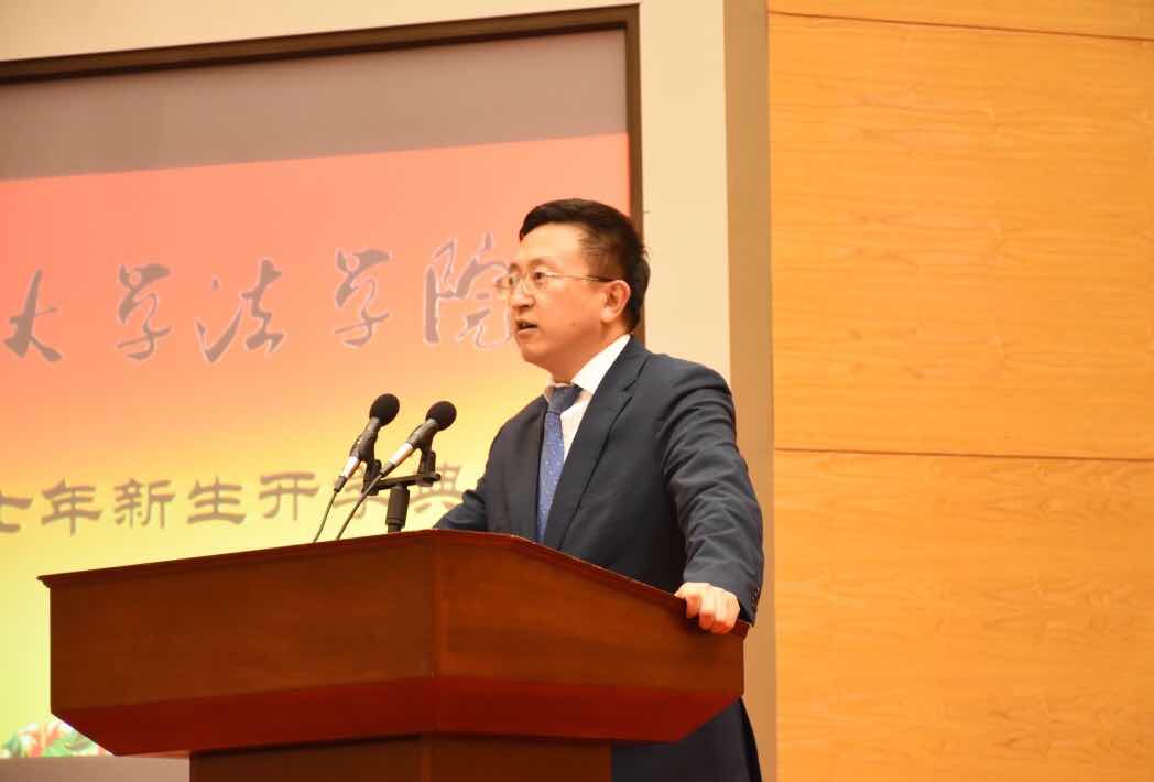 随后,教师代表侯学宾副教授进行发言,侯老师分别以理想、心态、学习、平台、行动作为关键词,向同学们就如何度过自己的大学生活提出了自己的建议。他认为大学应该是为每一个人发掘自己的可能性提供平台的地方,在这个平台上你要树立一个适合自己的目标并把它付诸于行动为之努力,以一个良好的心态去面对大学生活,要铭记一点学习才是学生的重中之重,切不可舍本逐末。学习的最高阶段是形成专业的法律思维,通过法学的视角去看待这个世界,认识这个社会。这种法律思维会让你获得继续学习的能力,去不断地应对各种未知的问题,甚至创造出新的知识。