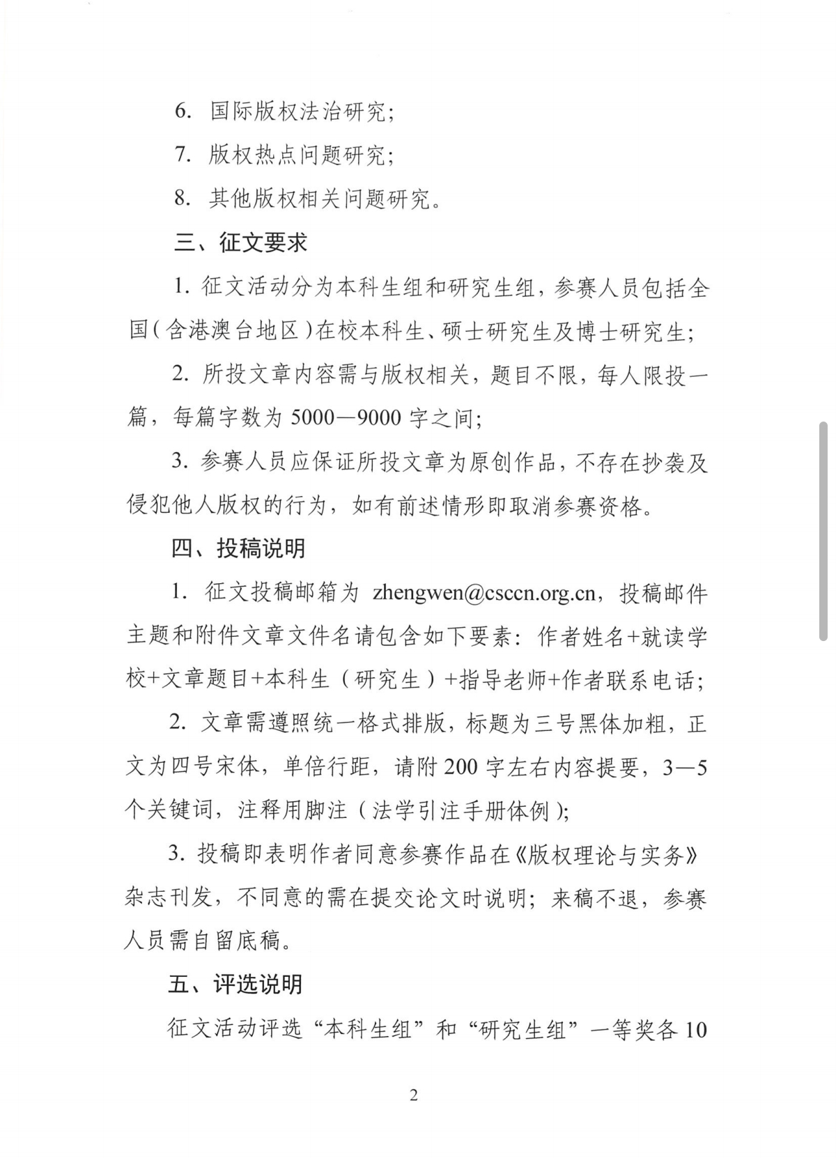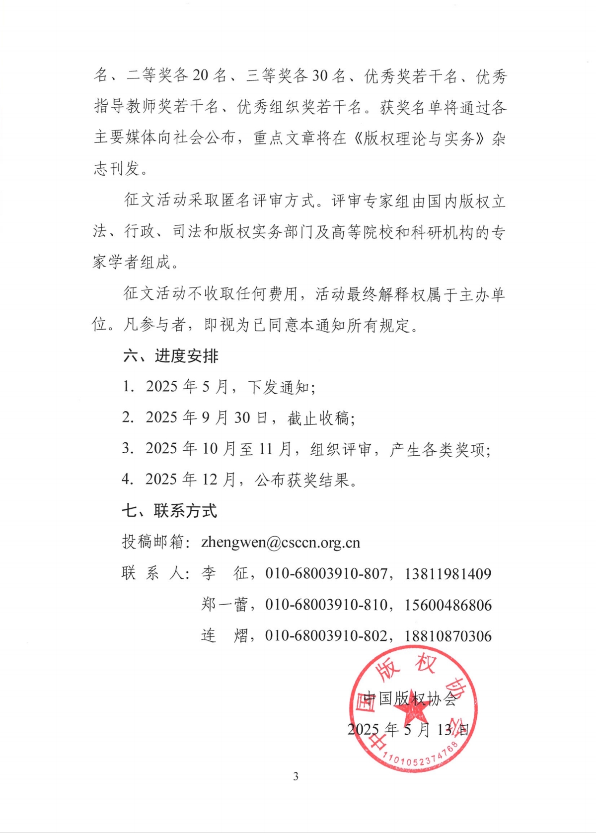 请关注中国版权协会发给的“关于开展全国大学生版权征文活动的通知”。请有意向参加的同学按照征文要求,于8月15日前将内容完整、格式准确的论文初稿发送至邮箱[email protected],文件名称为:【版权征文】姓名+题目。联系人:冀一冰 15136596378