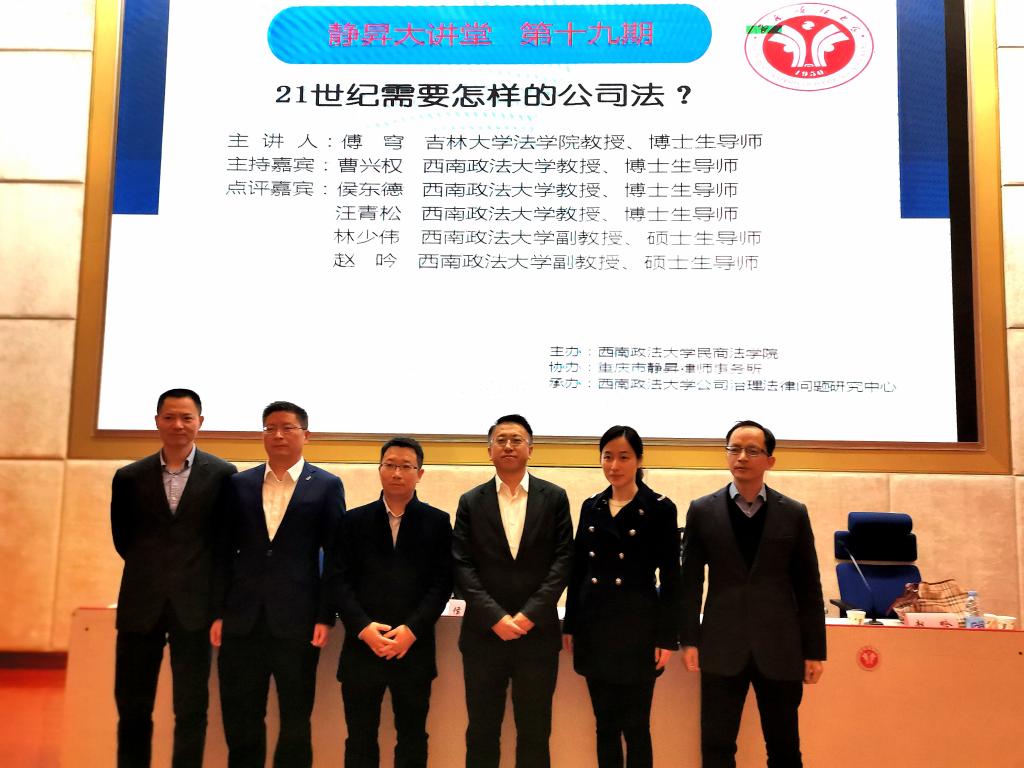 主办,重庆市静昇律师事务所协办,西南政法大学公司治理法律问题研究中心承办。本期讲座(第19期)以“公司法新一轮变革:路在何方”为主题,由西南政法大学曹兴权教授担任主持人,西南政法大学侯东德教授、汪青松教授、林少伟副教授和赵吟副教授作为点评嘉宾。