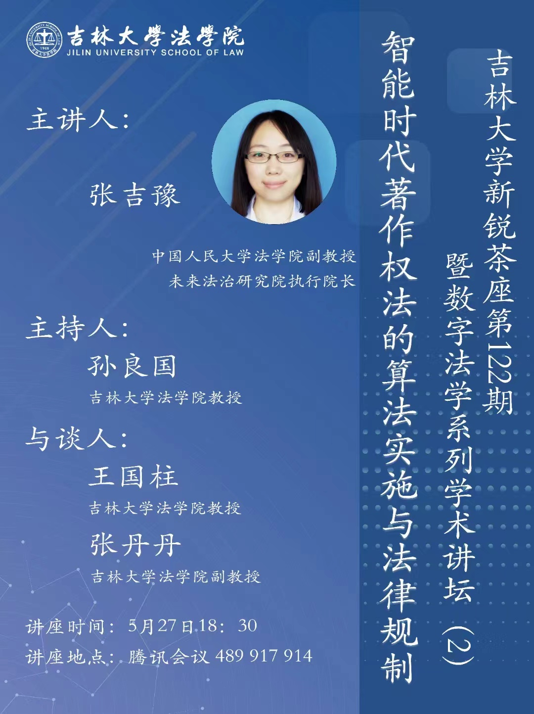 第122期新锐茶座暨第2期数字法学系列学术讲坛,讲座主题为“智能时代著作权法的算法实施与法律规制”。本次讲座由极速赛车